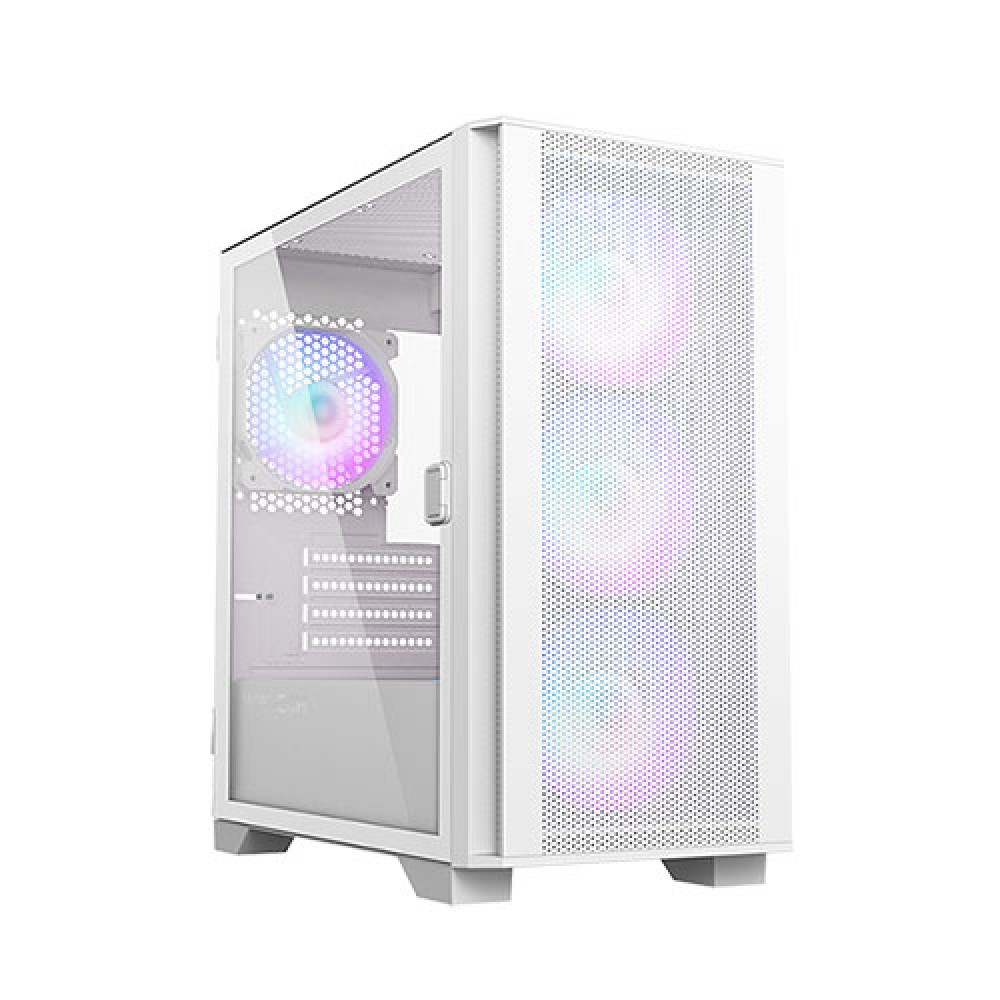 The Montech AIR 100 ARGB Micro ATX Casing in White is a sleek and compact gaming enclosure designed to provide an exceptional gaming experience while complementing your setup with its elegant aesthetics. This stylish casing boasts impressive features and functionality, making it an ideal choice for gamers and PC enthusiasts looking for a balance between performance, design, and affordability. The Montech AIR 100 ARGB Micro ATX Casing stands out with its eye-catching design and vibrant RGB lighting. The white color scheme gives it a clean and modern look, allowing it to seamlessly blend into any gaming setup. The front panel is adorned with a full-length ARGB strip that can be customized to match your preferences. With a variety of lighting effects and colors, you can create a mesmerizing visual display that enhances your gaming experience and adds a touch of personality to your PC. Despite its compact size, the Montech AIR 100 ARGB Micro ATX Casing offers excellent airflow and cooling capabilities. The front mesh panel, combined with the top and rear ventilation, allows for efficient heat dissipation, preventing overheating and ensuring optimal performance. The case also supports multiple fan configurations, including up to six 120mm fans or a 240mm radiator, enabling you to create a well-ventilated and cool gaming environment.